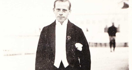 Leon van Leer op de boulevard in Scheveningen in zijn werkkleding als kelner.