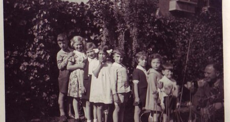 Foto uit midden jaren 30. Engelina is het derde kind van rechts. De man is Jessia Lissaur, Engelina's vader. De andere kinderen zijn waarschijnlijk leerlingen van de Montessori School.